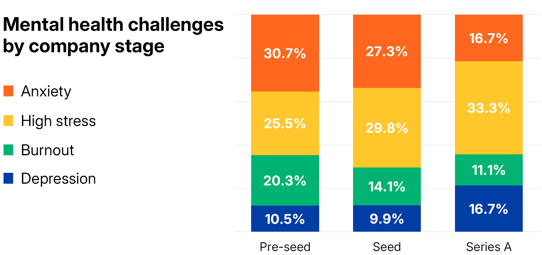 Respondents were asked if they experienced episodes of anxiety (heightened worries related to uncertainty about the future), stress (extreme psychological strain caused by demanding circumstances), burnout (physical or mental collapse resulting from overwork or stress) and/or depression (persistent sadness and disinterest that adversely affects day-to-day life) over the past few months. Those whose ventures were still in a pre-seed stage were the most likely to experience anxiety and burnout.