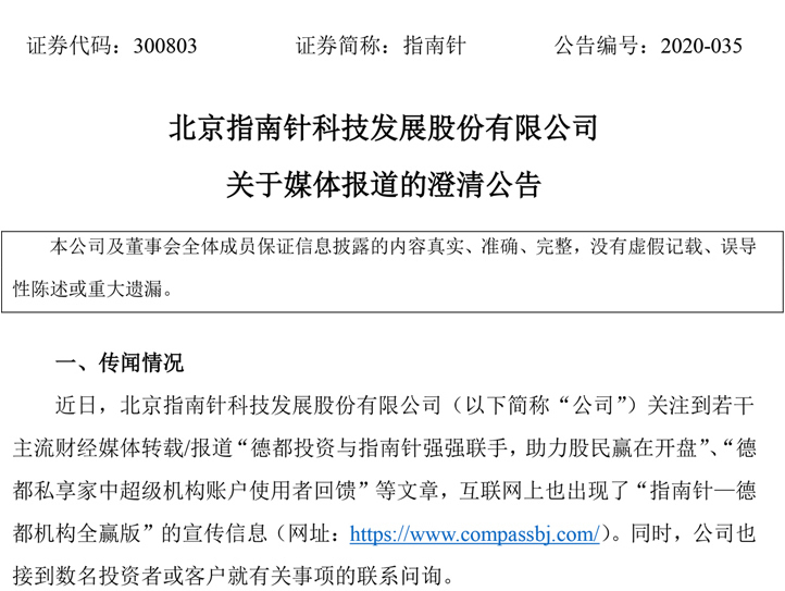 北京指南针科技发展股份有限公司 关于媒体报道的澄清公告